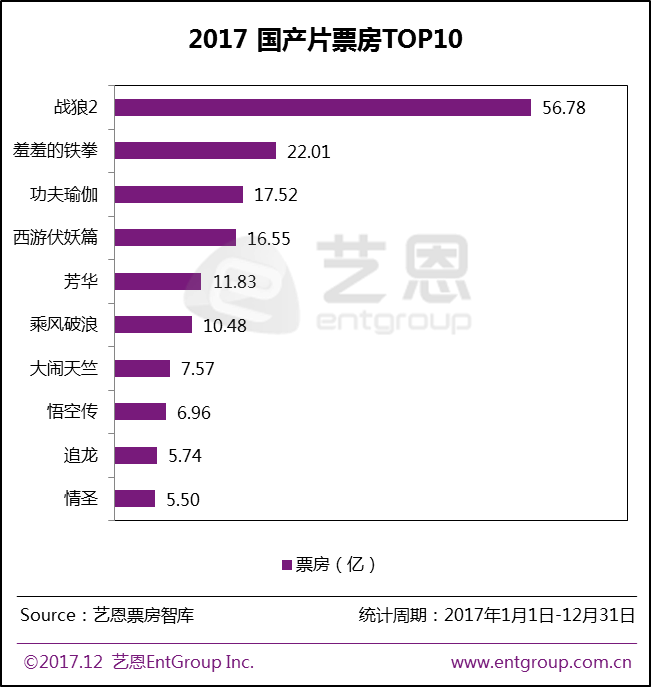 2017年共有6部国产片票房过10亿,其中《战狼2》以56.78亿的成绩一骑绝尘,强势登顶内地影史票房冠军宝座。此外,电影新势力在2017年迎来全面崛起:从演员转型导演的吴京带来《战狼2》,从话剧转型电影的开心麻花团队带来《羞羞的铁拳》,从作家转型导演的韩寒带来《乘风破浪》,纷纷迎来票房口碑双丰收。