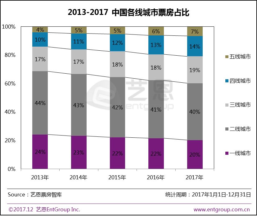 2017年内地票房继续向三四五线城市下沉。一线城市票房占比下降至20%,三四五线城市票房占比同时提升,合计占比达到了40%,相比2016年提升3%。随着三四五线城市成为活跃票仓,小镇青年消费水平的不断提升,电影市场将迎来更多增量机会,同时观影人群结构也将进一步优化。