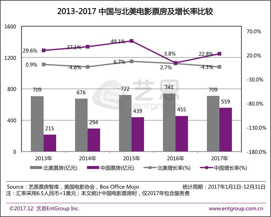截止2017年12月31日,国内电影总票房再创新高达到559亿元,增长率也止跌回升,以22.8%的增速回归“快车道”(注:本文统计票房时,仅2017年包含服务费)。同时,北美电影市场票房连续五年增长停滞,2017年总票房为709亿,增长率-4.3%,与中国市场票房差距不断缩小。经过2016年的一场降温,中国电影市场进入短暂调整期,挤出泡沫,迎来以优质内容驱动的创新增长期。未来三年内,中国电影票房有望超过北美,跃升全球第一大电影市场。