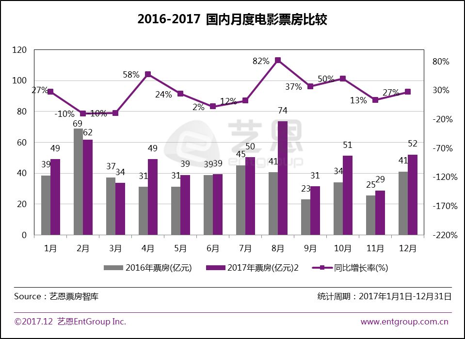 2017单月最高票房为74亿,出现在8月,单月最低票房为29亿,出现在11月。暑期档、国庆档表现优异,难改市场的冷热不均。2017年1月,《功夫瑜伽》《西游伏妖篇》等多部影片带热市场,票房同比增长27%。但2、3月市场持续“遇冷”,拖累上半年整体票房同比增长仅为11%。暑期档《战狼2》横空出世,强势拉动8月单月票房突破74亿,同比增长高达82%。在有力提振市场的同时,也极大拉升了全年的增长率。
