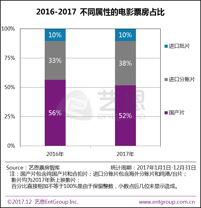2017年新上映影片(指在2017年上映的影片)共483部,票房总计543亿,其中国产片、进口分账片、进口批片票房占比分别为52%、38%、10%。今年国产片票房占比较去年下跌4%,进口分账片票房占比提升,国产片竞争力相对有所下降,如何“与狼共舞”,迎击海外竞争,依然任重而道远。