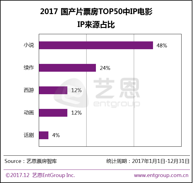 IP电影在国产片头部作品中的优势仍然较为显著,2017年国产片票房TOP50中IP电影攻陷半壁江山,数量达到25部,票房占比高达65%。若去除《战狼2》的影响,票房占比仍有55%,依然高于2015年和2016年。纵观今年25部IP改编电影,IP源头为小说的数量占比达到48%,小说依然为IP改编的最大源头。