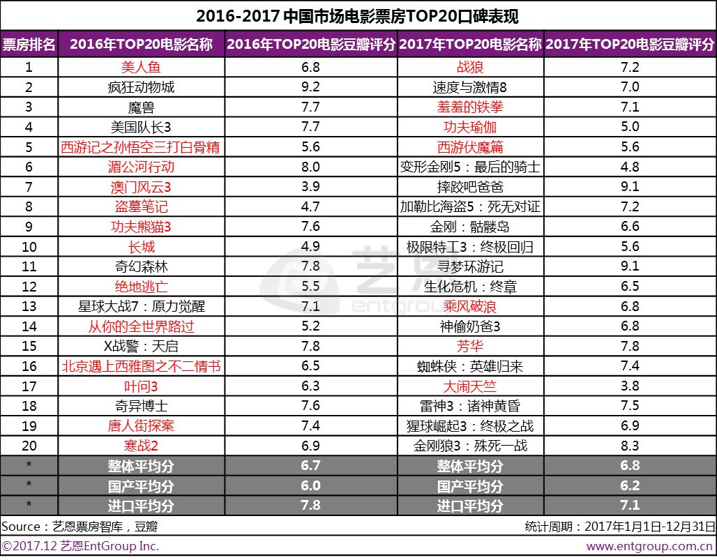 2017年国产片在票房TOP20中占据7席,较去年有所减少,但在票房TOP5中国产片一举揽下4席,优势进一步提升。在票房TOP20的国产片中,豆瓣平均分为6.2,口碑较去年整体有所提升。与此同时,今年多部好莱坞大片席卷榜单,票房表现出色,其中电影续作占比达到约八成,但其口碑平均分对比去年下滑明显,如《变形金刚5》《极限特工3》等电影续作评分不到6分。