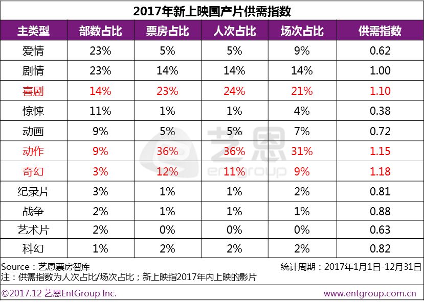 今年新上映的国产片中,动作片、喜剧片票房占比均超过20%,两者合计占比达59%,携手撑起票房“半边天”。爱情片数量最多,但票房占比仅为5%,供需指数仅为0.62,票房产出较低,已呈现供大于求的现象。