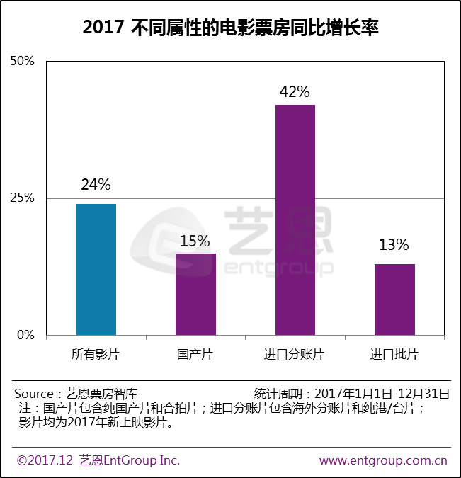 2017年进口分账片票房增长率高达42%,远超国产片和批片,以《速度与激情8》为首的7部分账片票房超过10亿,去年仅为3部。《摔跤吧爸爸》《天才枪手》等多部批片表现抢眼,但批片票房占比仍与去年持平,整体竞争力仍不及分账片。