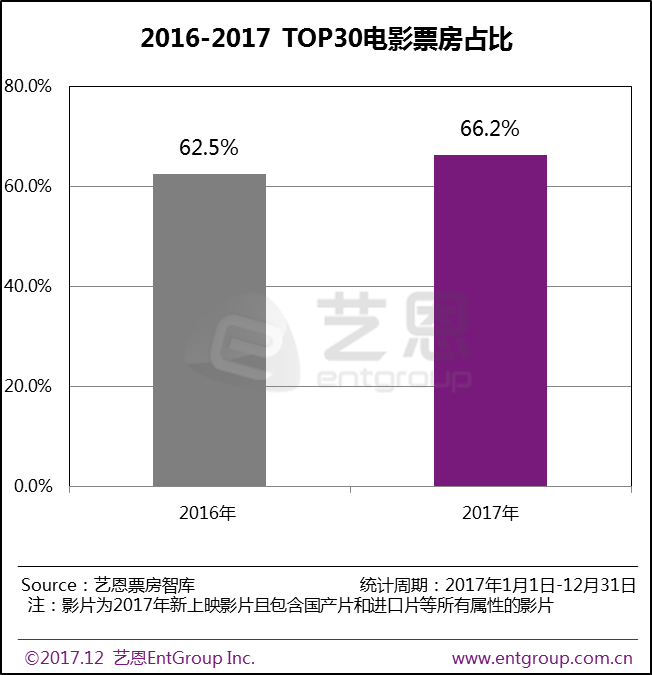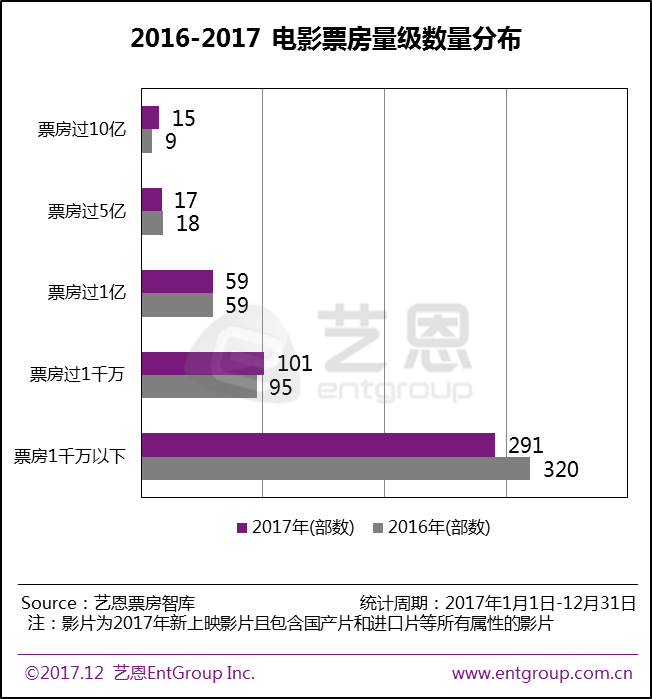 2017年,中国电影市场集中度进一步提升,马太效应加剧,行业进入稳定发展期。今年TOP30的影片票房在全年总票房中占比达到66.2%,相比2016年的62.5%提升近4个百分点。影片票房分区间的数量分布,同样呈现典型的金字塔结构,15部票房过10亿影片强势垄断全年票房近五成。此外,票房“10亿俱乐部”再度扩容,数量达到15部,同比去年增长近七成。与此同时,今年仍有约六成的电影票房不到1千万。