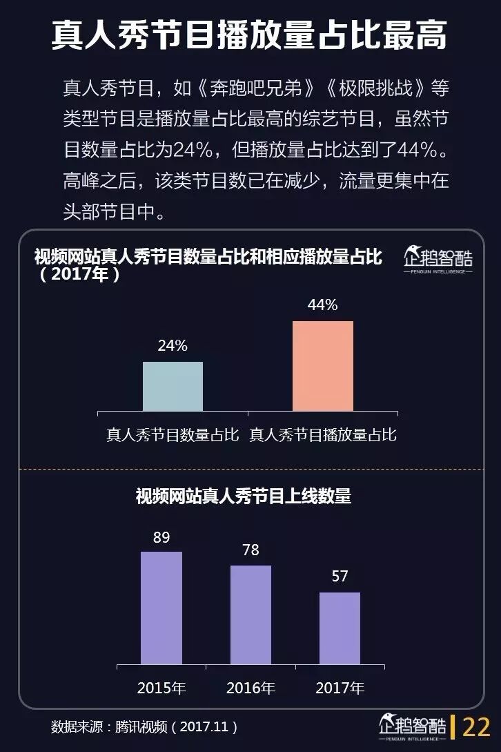 真人秀节目,如《奔跑吧兄弟》《极限挑战》等类型节目是播放量占比最高的综艺节目,虽然节目数量占比为24%,但播放量占比达到了44%。高峰之后,该类节目数已在减少,流量更集中在头部节目中。