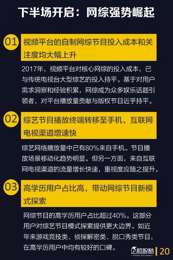 视频平台的自制网综节目投入成本和关注度均大幅上升;综艺节目播放终端转移至手机,互联网电视渠道增速快; 高学历用户占比高,带动网综节目新模式探索。