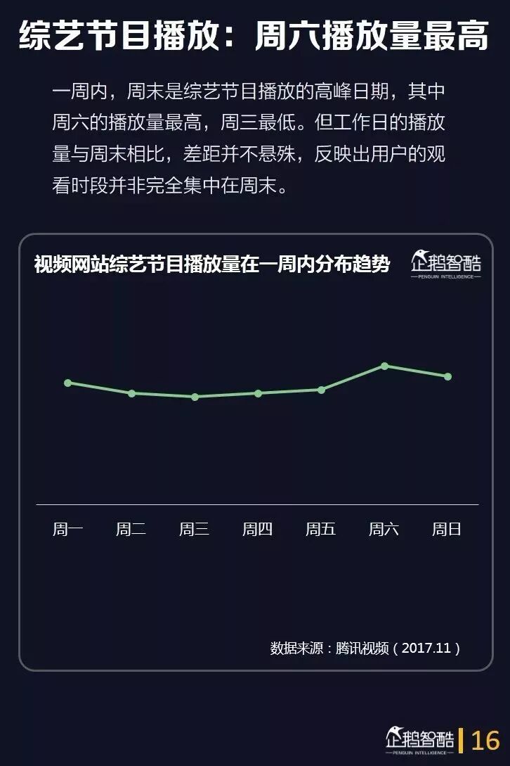 一周内,周末是综艺节目播放的高峰日期,其中周六的播放量最高,周三最低。但工作日的播放量与周末相比,差距并不悬殊,反映出用户的观看时段并非完全集中在周末。