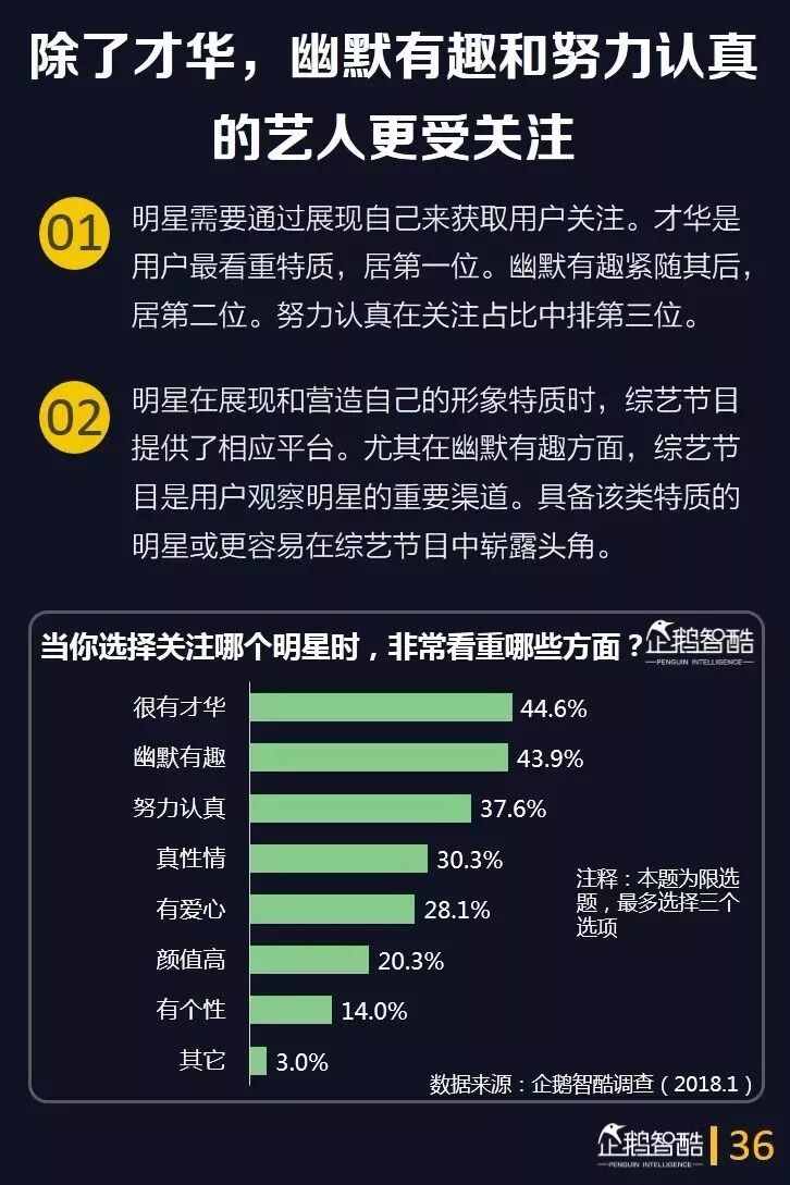 明星需要通过展现自己来获取用户关注。才华是用户最看重特质,居第一位。幽默有趣紧随其后,居第二位。努力认真在关注占比中排第三位。