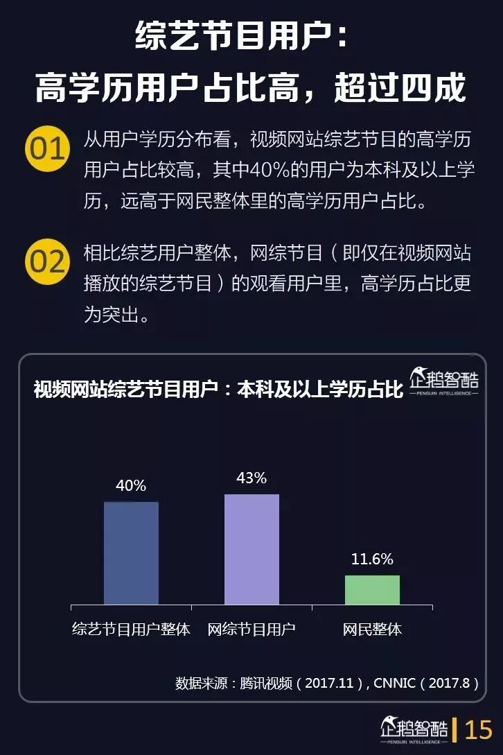 从用户学历分布看,视频网站综艺节目的高学历用户占比较高,其中40%的用户为本科及以上学历,远高于网民整体里的高学历用户占比。