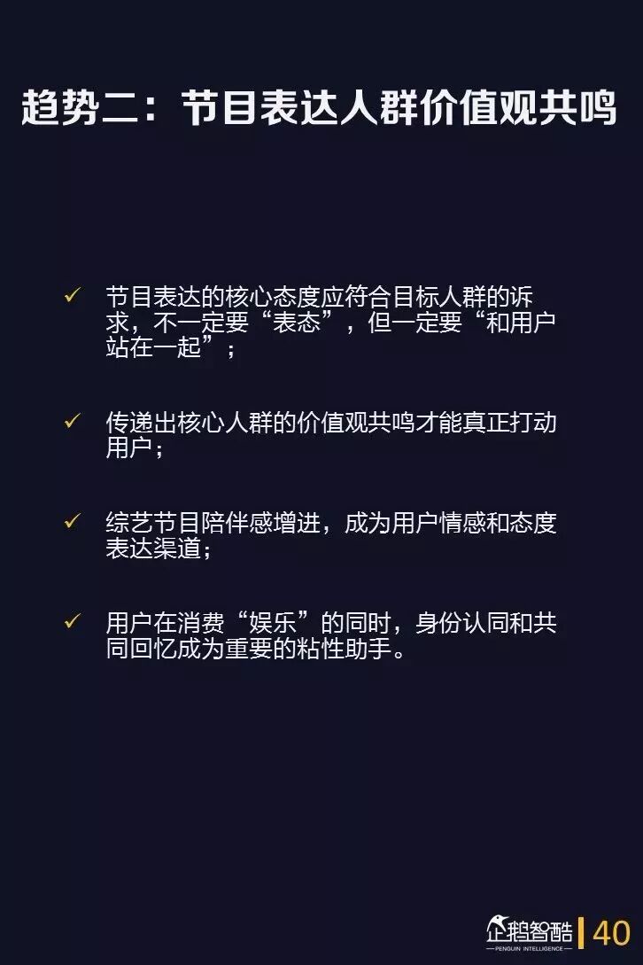 节目表达的核心态度应符合目标人群的诉求,不一定要“表态”,但一定要“和用户站在一起”;传递出核心人群的价值观共鸣才能真正打动用户;综艺节目陪伴感增进,成为用户情感和态度表达渠道;用户在消费“娱乐”的同时,身份认同和共同回忆成为重要的粘性助手。