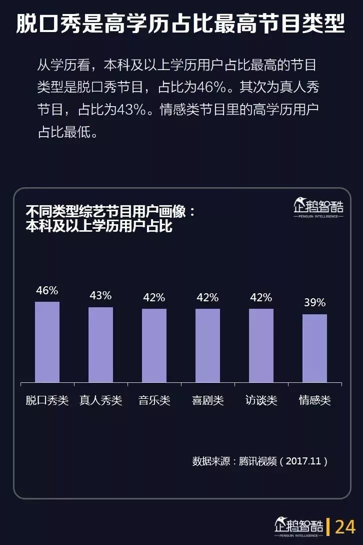 从学历看,本科及以上学历用户占比最高的节目类型是脱口秀节目,占比为46%。其次为真人秀节目,占比为43%。情感类节目里的高学历用户占比最低。