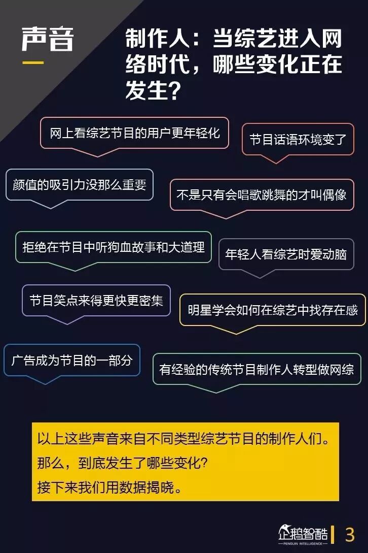 企鹅智库报告从年轻用户的观看概况、中国综艺播放的新变化、细分用户的综艺喜好差异、综艺市场的前景展望等方面洞察综艺用户,对综艺发展新趋势展开预测。