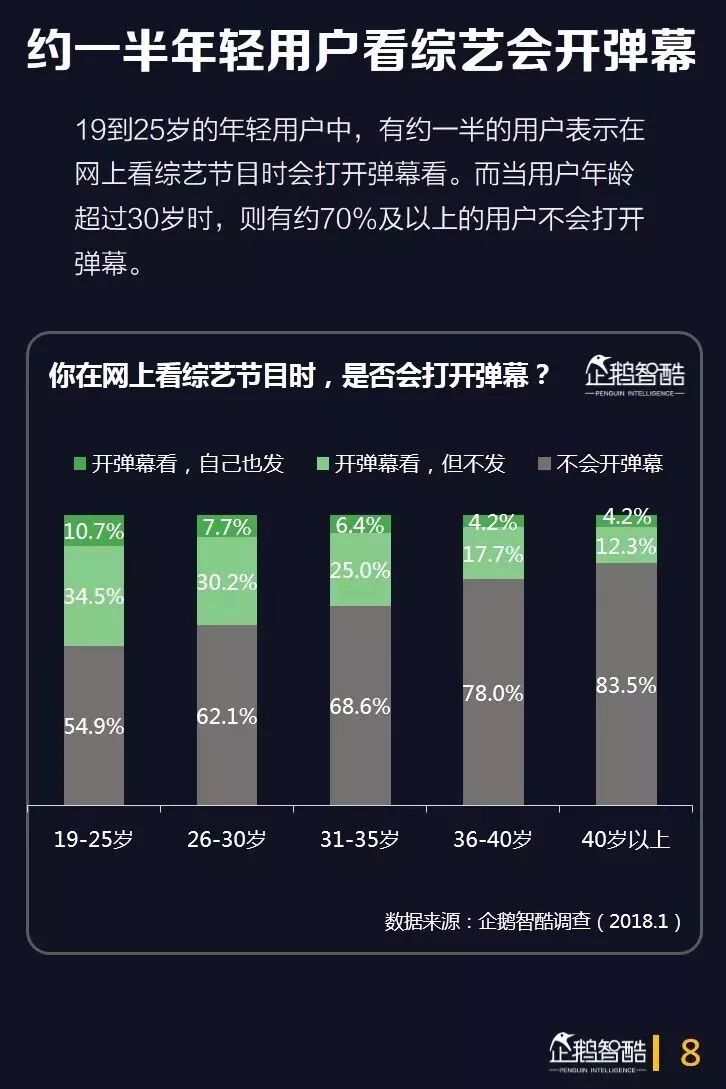 19到25岁的年轻用户中,有约一半的用户表示在网上看综艺节目时会打开弹幕看。互动社区是他们获取和表达意见的阵地。