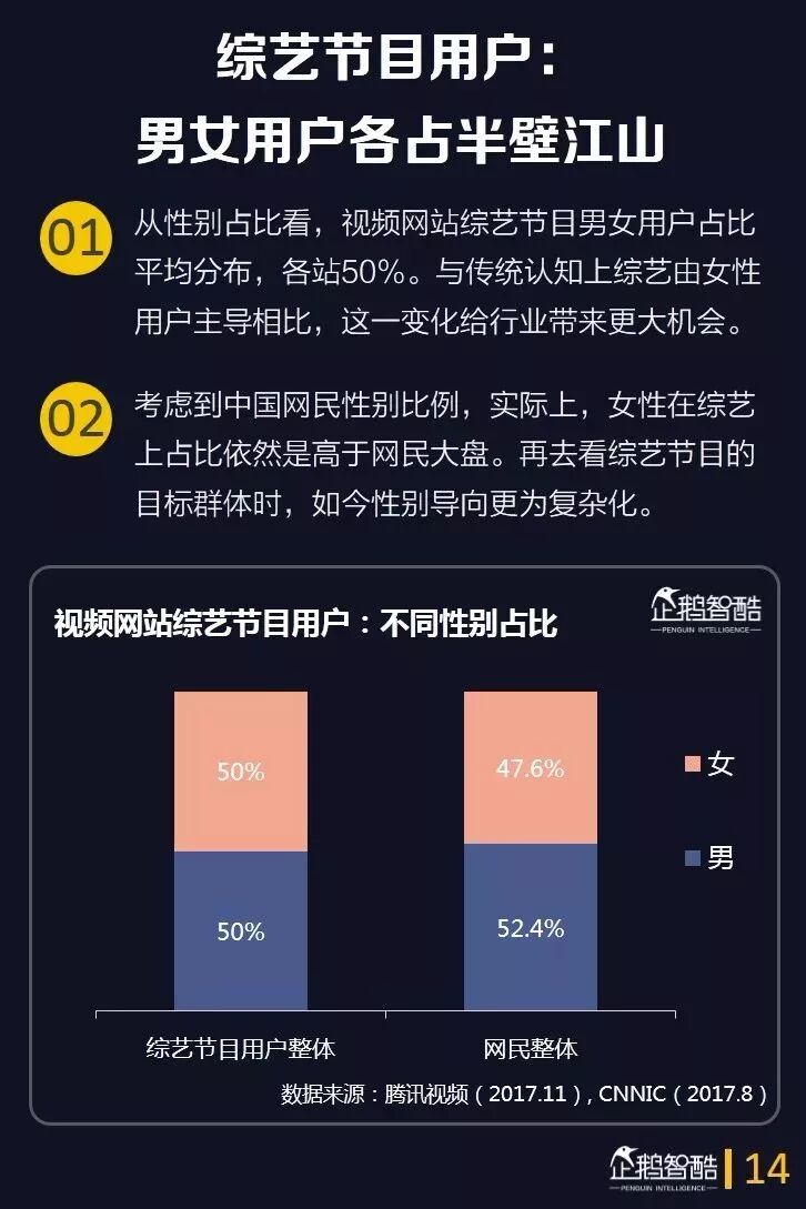 考虑到中国网民性别比例,实际上,女性在综艺上占比依然是高于网民大盘。再去看综艺节目的目标群体时,如今性别导向更为复杂化。