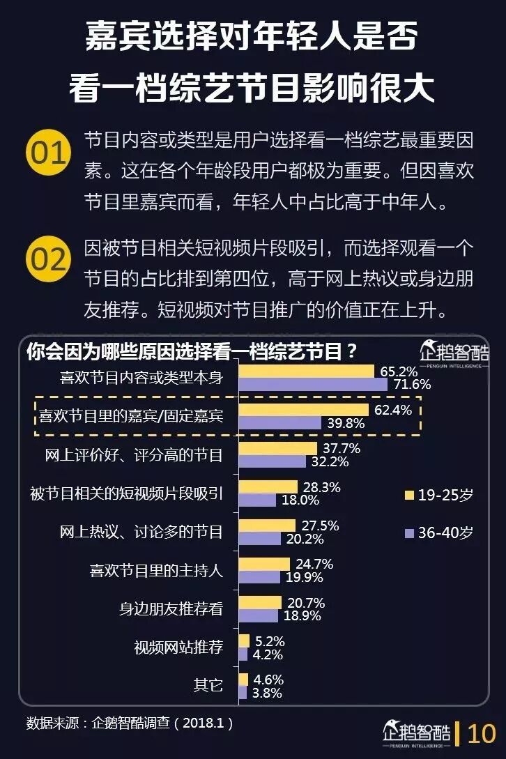 节目内容或类型是用户选择看一档综艺最重要因素。这在各个年龄段用户都极为重要。但因喜欢节目里嘉宾而看,年轻人中占比高于中年人。