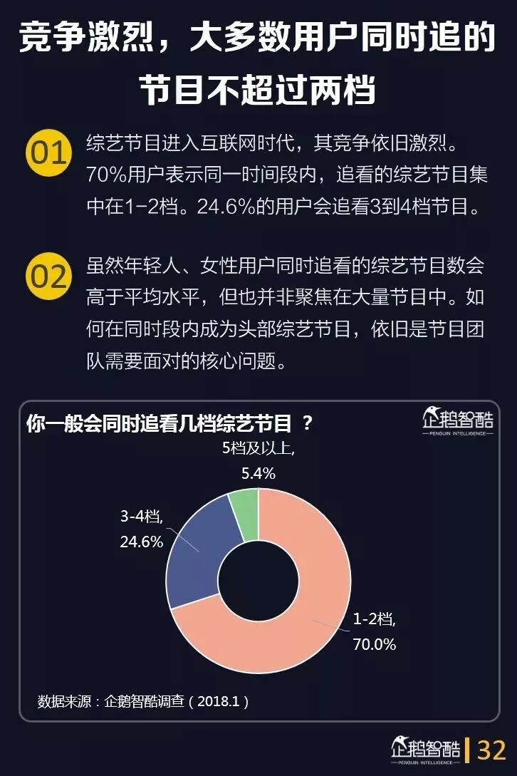 综艺节目进入互联网时代,其竞争依旧激烈。70%用户表示同一时间段内,追看的综艺节目集中在1-2档。24.6%的用户会追看3到4档节目。