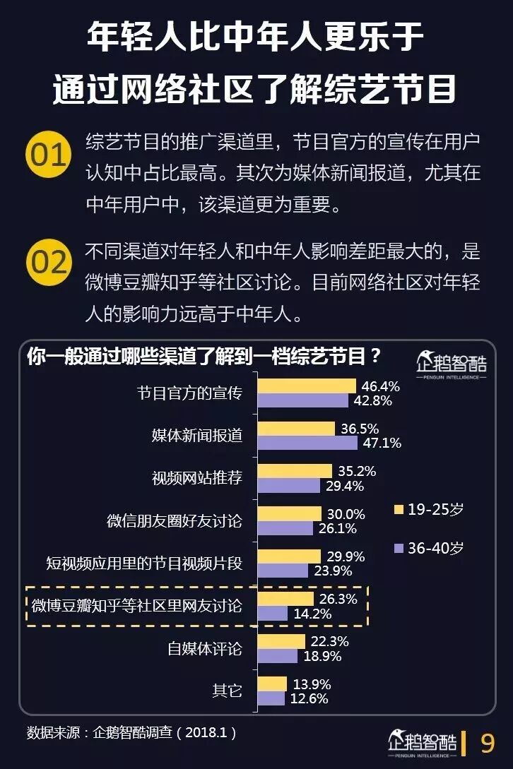 综艺节目的推广渠道里,节目官方的宣传在用户认知中占比最高。其次为媒体新闻报道,尤其在中年用户中,该渠道更为重要。