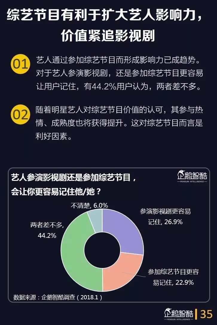 艺人通过参加综艺节目而形成影响力已成趋势。对于艺人参演影视剧,还是参加综艺节目更容易让用户记住,有44.2%用户认为,两者差不多。随着明星艺人对综艺节目价值的认可,其参与热情、成熟度也将获得提升。这对综艺节目而言是利好因素。