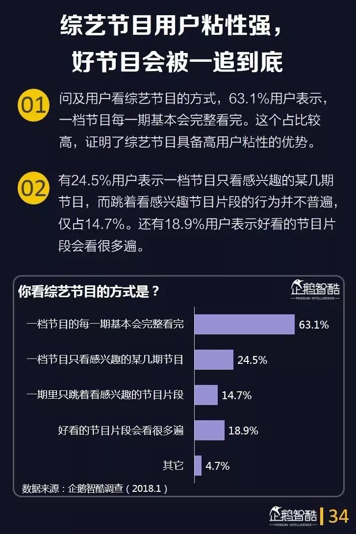 问及用户看综艺节目的方式,63.1%用户表示,一档节目每一期基本会完整看完。这个占比较高,证明了综艺节目具备高用户粘性的优势。