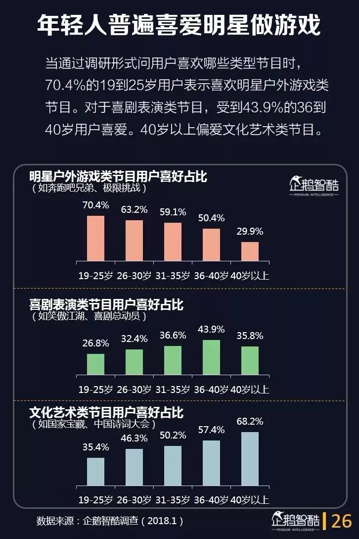 当通过调研形式问用户喜欢哪些类型节目时,70.4%的19到25岁用户表示喜欢明星户外游戏类节目。对于喜剧表演类节目,受到43.9%的36到40岁用户喜爱。40岁以上偏爱文化艺术类节目。