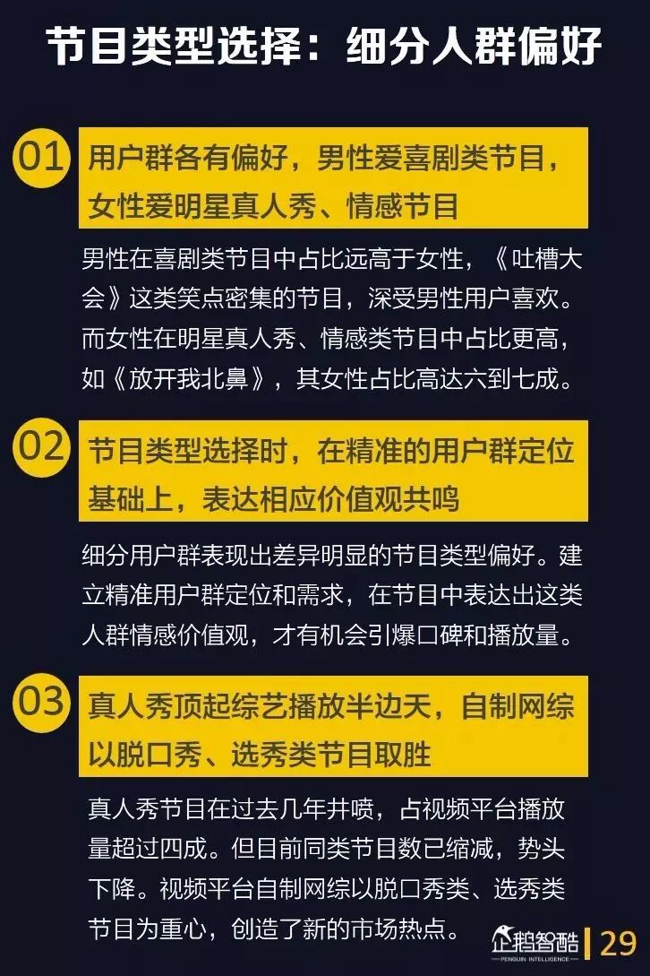 用户群各有偏好,男性爱喜剧类节目,女性爱明星真人秀、情感节目;节目类型选择时,在精准的用户群定位基础上,表达相应价值观共鸣; 真人秀顶起综艺播放半边天,自制网综以脱口秀、选秀类节目取胜。