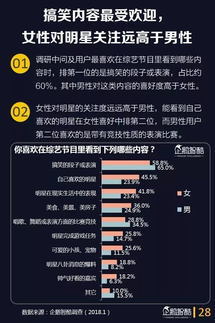 调研中问及用户最喜欢在综艺节目里看到哪些内容时,排第一位的是搞笑的段子或表演,占比约60%。其中男性对这类内容的喜好度高于女性。