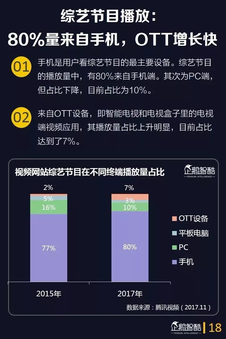 手机是用户看综艺节目的最主要设备。综艺节目的播放量中,有80%来自手机端。其次为PC端,但占比下降,目前占比为10%。