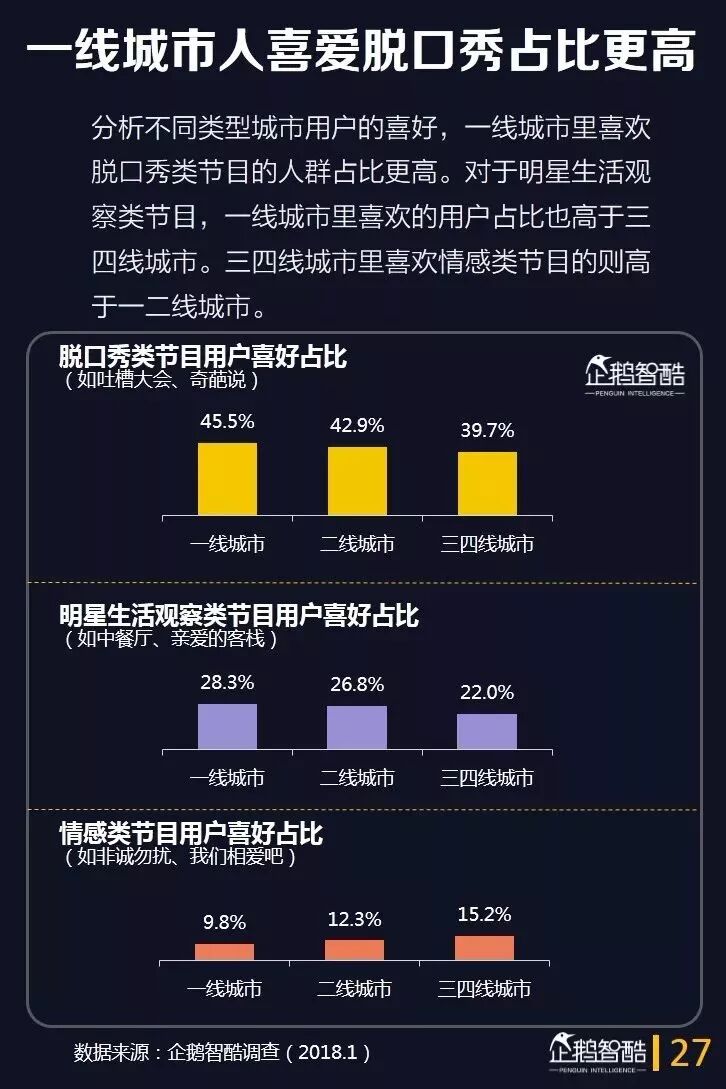 分析不同类型城市用户的喜好,一线城市里喜欢脱口秀类节目的人群占比更高。对于明星生活观察类节目,一线城市里喜欢的用户占比也高于三四线城市。三四线城市里喜欢情感类节目的则高于一二线城市。
