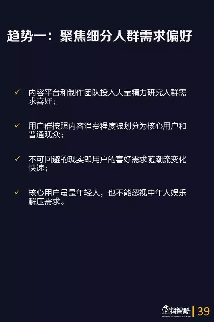 内容平台和制作团队投入大量精力研究人群需求喜好;用户群按照内容消费程度被划分为核心用户和普通观众;不可回避的现实即用户的喜好需求随潮流变化快速核心用户虽是年轻人,也不能忽视中年人娱乐解压需求。