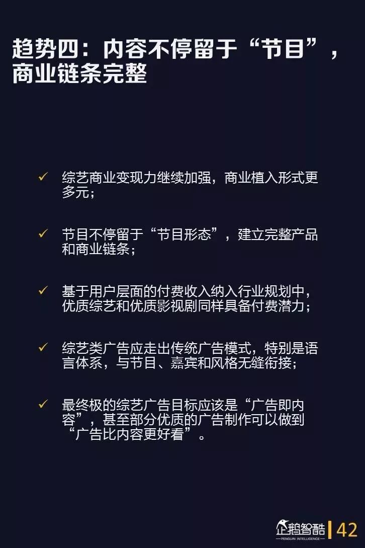 综艺商业变现力继续加强,商业植入形式更多元;节目不停留于“节目形态”,建立完整产品和商业链条;基于用户层面的付费收入纳入行业规划中,优质综艺和优质影视剧同样具备付费潜力。