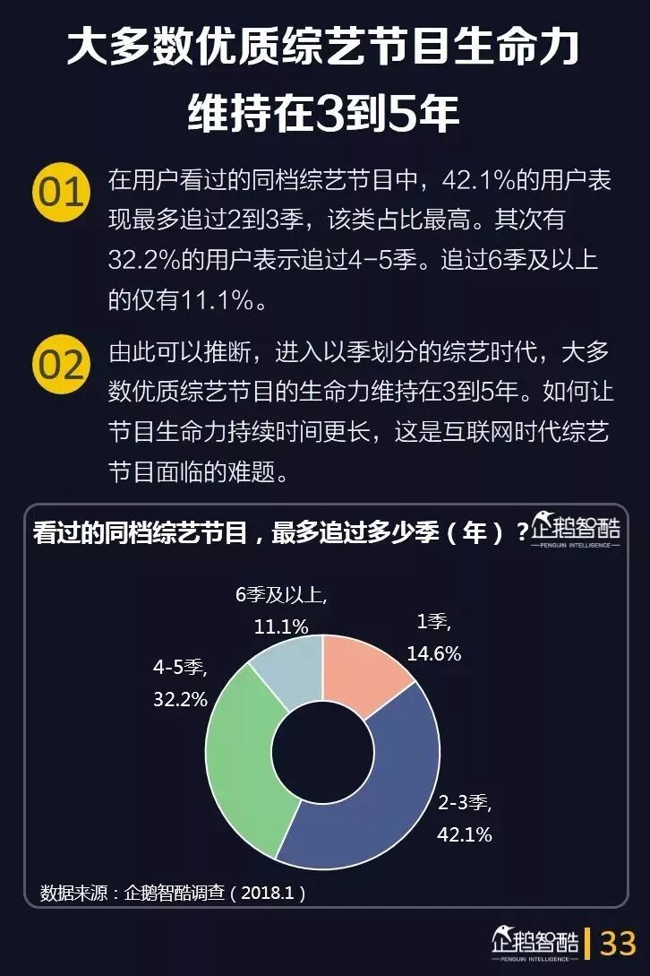 由此可以推断,进入以季划分的综艺时代,大多数优质综艺节目的生命力维持在3到5年。如何让节目生命力持续时间更长,这是互联网时代综艺节目面临的难题。