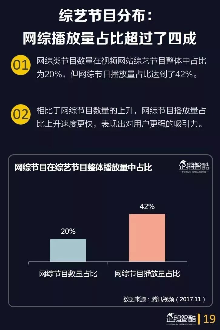 网综类节目数量在视频网站综艺节目整体中占比为20%,但网综节目播放量占比达到了42%。相比于网综节目数量的上升,网综节目播放量占比上升速度更快,表现出对用户更强的吸引力。