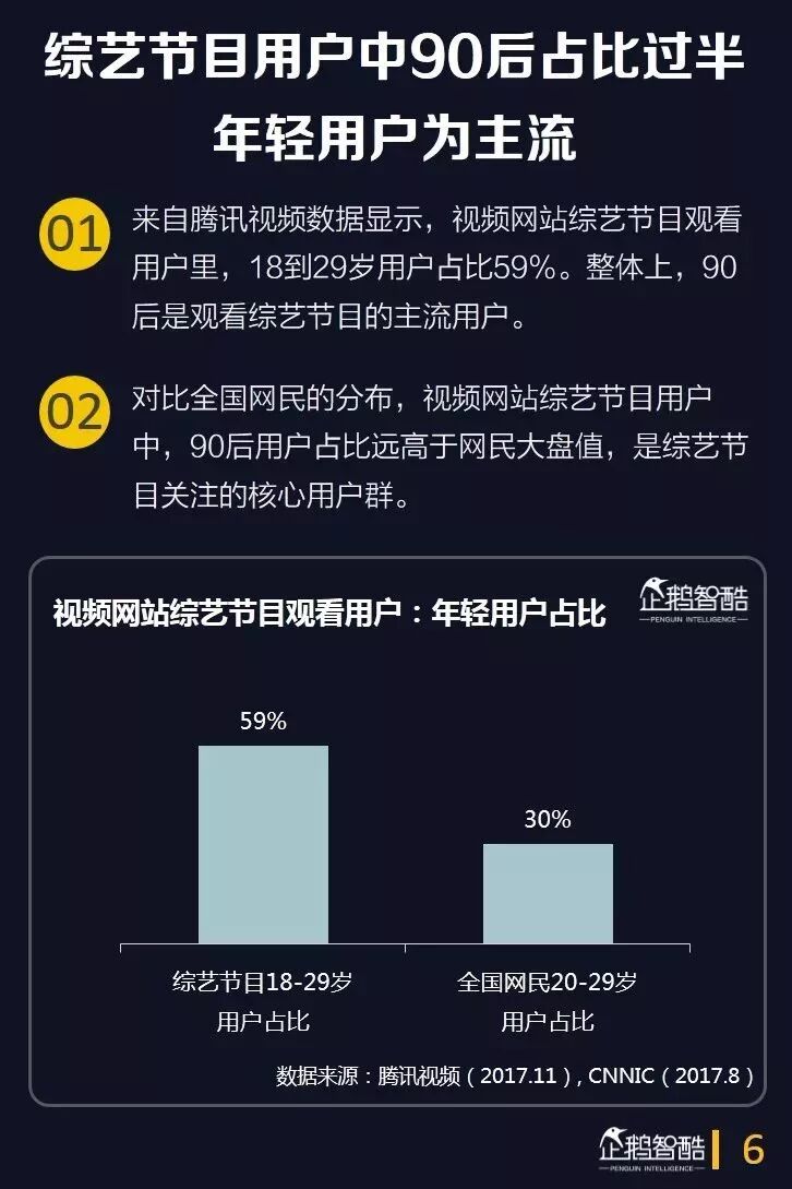 数据显示,视频网站综艺节目观看用户里,18到29岁用户占比59%。整体上,90后是观看综艺节目的主流用户。