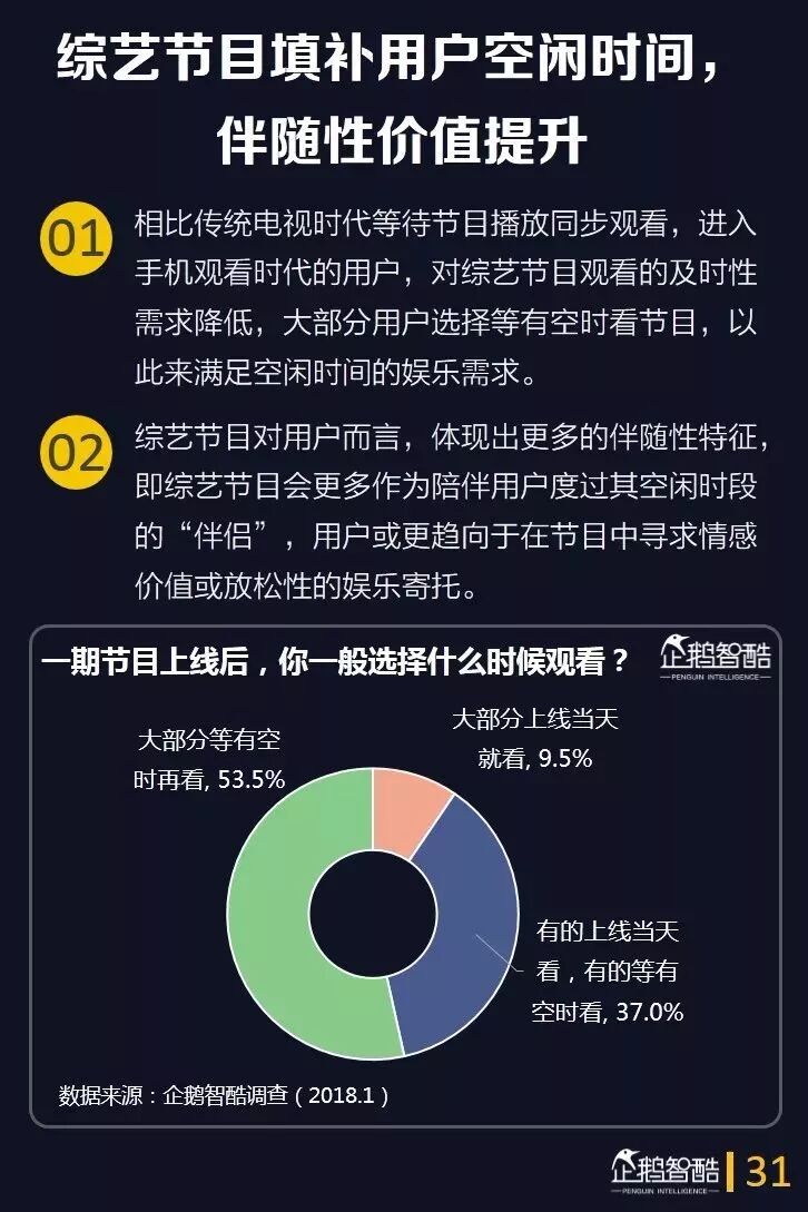相比传统电视时代等待节目播放同步观看,进入手机观看时代的用户,对综艺节目观看的及时性需求降低,大部分用户选择等有空时看节目,以此来满足空闲时间的娱乐需求。