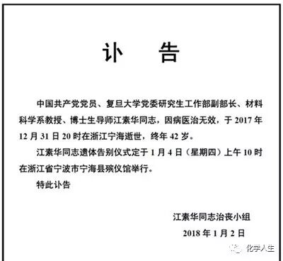 复旦大学党委研究生工作部副部长、材料科学系教授、博士生导师江素华教授,因病医治无效,于2017年12月31日20时不幸辞世。