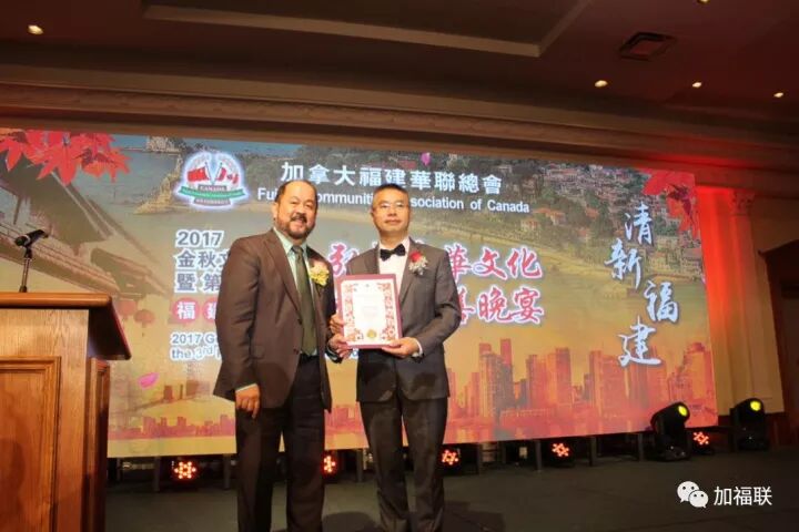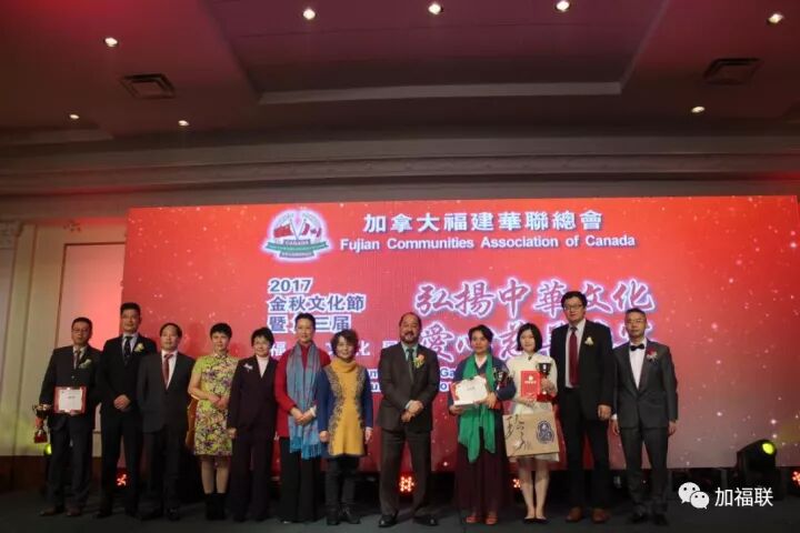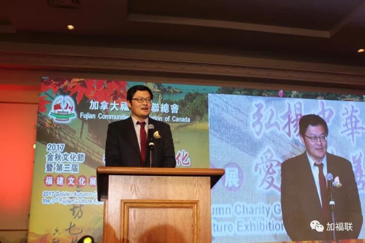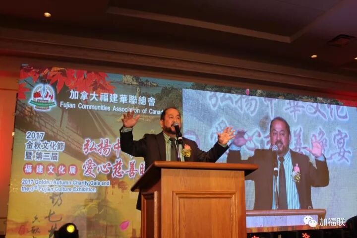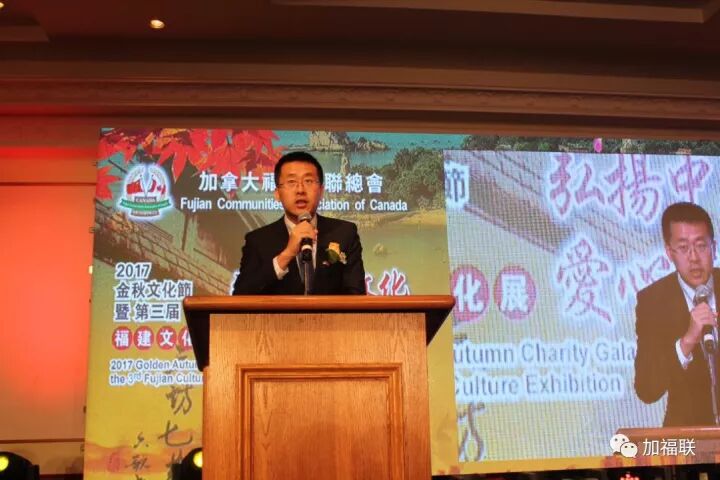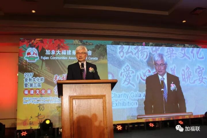 加拿大联邦国会议员Geng Tan谭耕同时向大会转交了加拿大联邦总理特鲁多的贺信;加拿大联邦参议员TobiasEnverga向大会转交了加拿大联邦保守党领袖,国会议员安卓· 希尔的贺信。加拿大联邦参议员Tobias Enverga, 加拿大联邦国会议员Geng Tan谭耕;中华人民共和国驻多伦多总领馆侨务领事杨葆华;多伦多市议员Chin Lee李振光,万锦市议员Alan Ho何胡景等嘉宾先后发表了热情洋溢的讲话,热烈庆祝本届福建文化展暨金秋晚宴盛大开幕,同时对加拿大福建华联总会多年来在团结与服务旅加福建乡亲,在推动加中文化,经贸,以及科技交流与合作,在推动华人社区和谐与加拿大多元文化发展等方面所作出的巨大贡献表示赞赏与肯定。